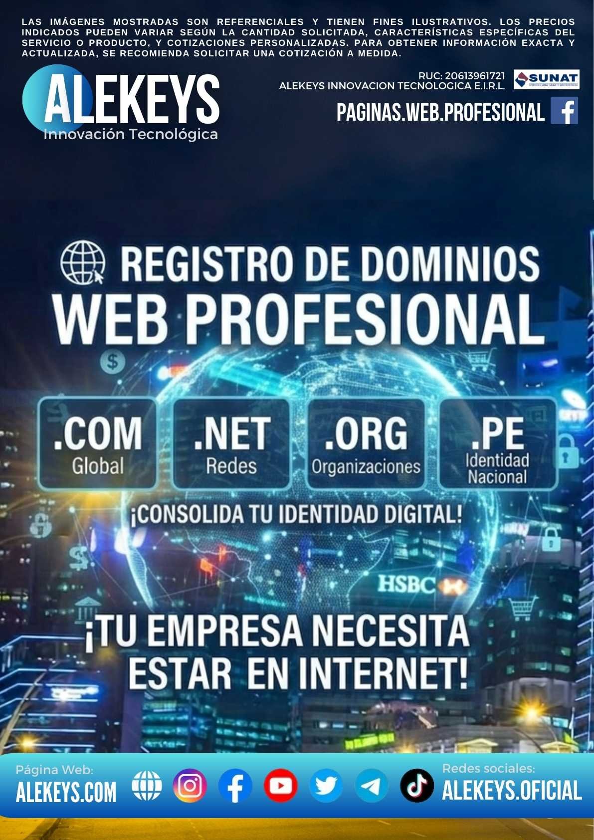 Dominio web que representa la identidad digital de tu negocio en internet. Permite crear una presencia profesional con extensiones como .com, .net o .pe, facilitando el posicionamiento, la confianza del usuario y la conexión con clientes en línea.